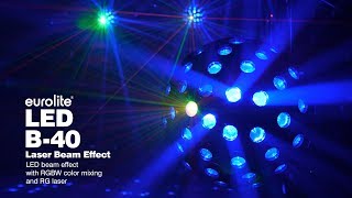 El Eurolite LED B-40 es un efecto de haz giratorio de alta luminosidad con mezcla de colores RGBW, láser R/G, velocidad de rotación ajustable de forma continua, atenuador y efecto stroboscópico.