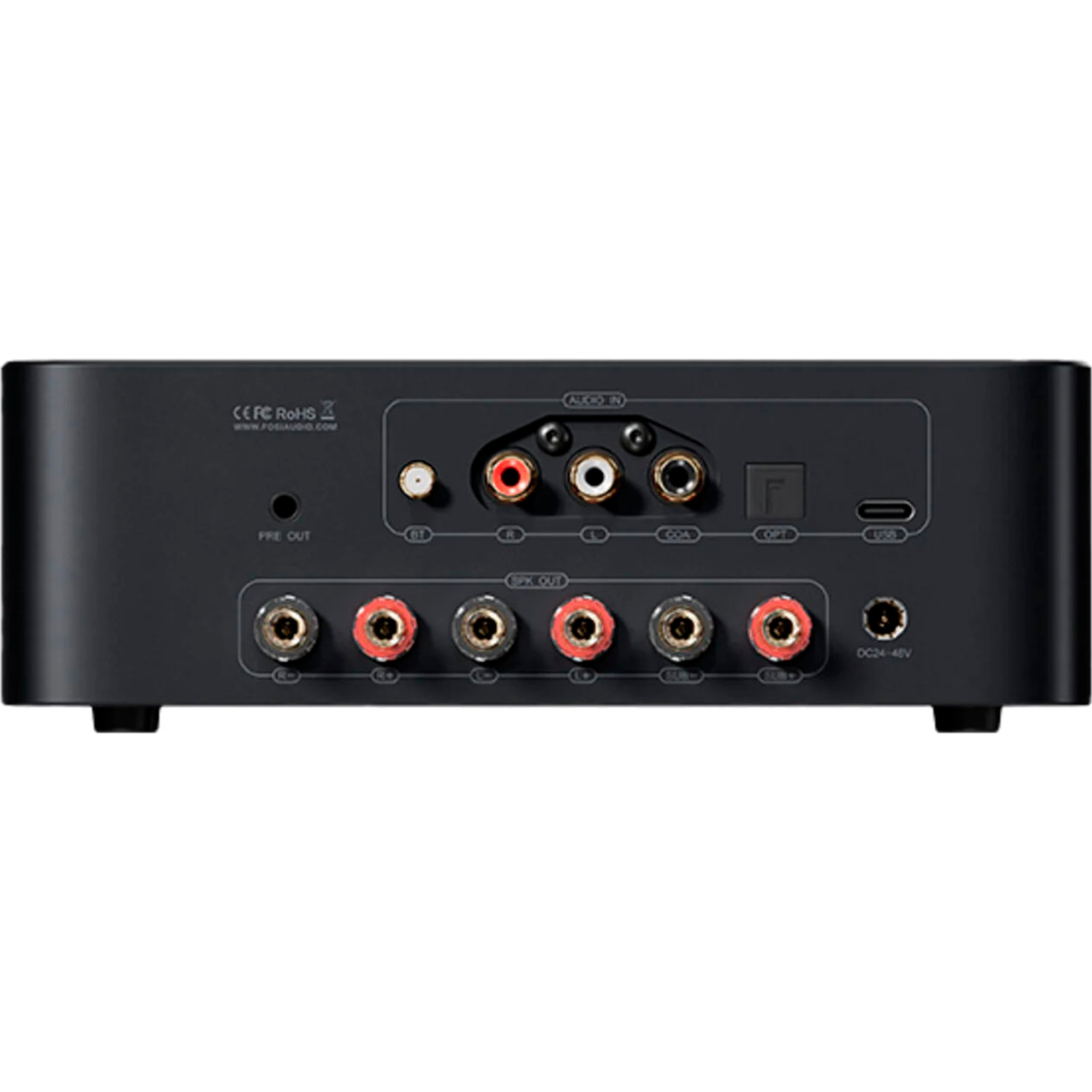 Amplificador digital 2.1 con salida preamplificada para más amplificadores o altavoces activos.