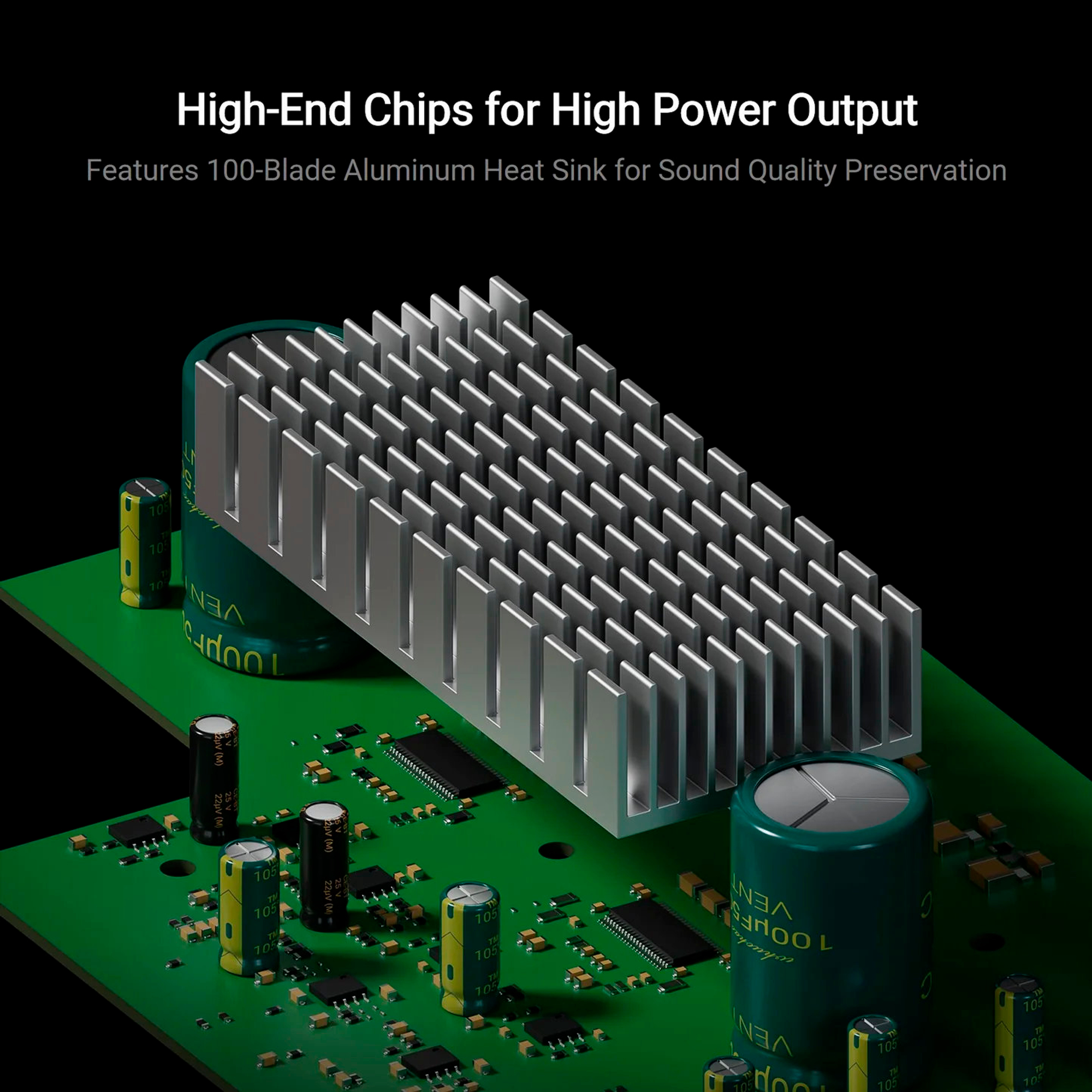 Con condensadores de alta capacidad y calidad que mejoran la calidad de sonido, el rango dinámico y la estabilidad, además de prolongar la vida útil del amplificador.